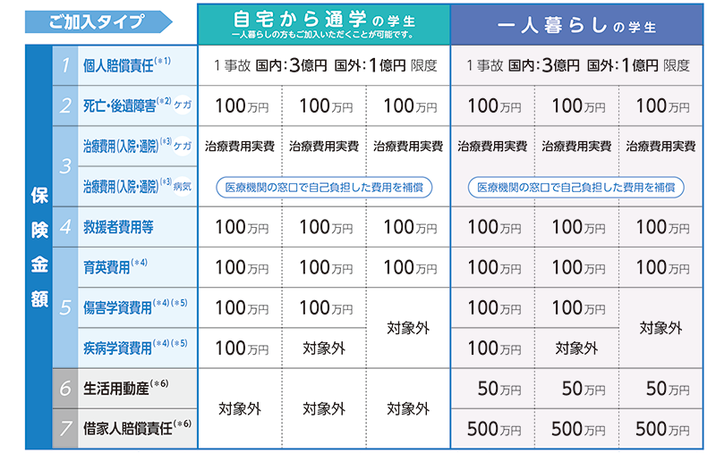 本学では、在籍学生全員が学生教育研究災害傷害保険に加入しています。この保険は、教育研究活動中・課外活動中の事故に備えるためのものです。医療機関で治療を受けた怪我を 対象とするもので「病気」は対象となりません。大学が加入手続きしますので、個人での申し込みは必要ありません。