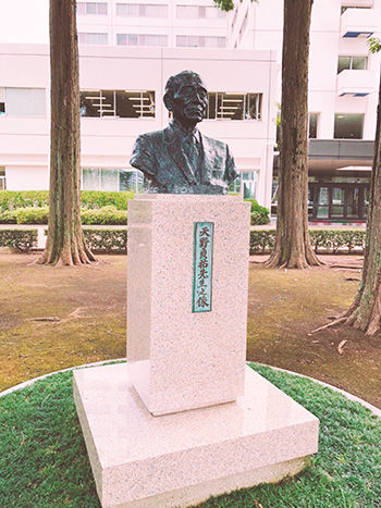 正門を入った前庭の木々の中には、獨協学園100周年を記念して建てられた創設者天野貞祐先生の銅像があります。実は天野先生は大の野球好きで、野球殿堂入りも果たしているって知っていましたか?