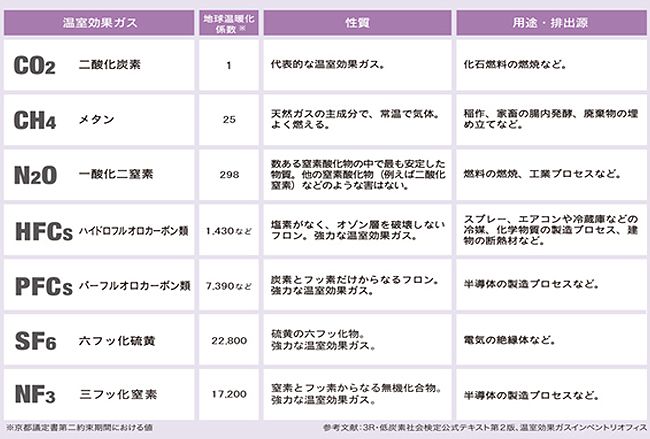 温室効果ガスとは、地球温暖化の主な要因といわれる気体で、赤外線を吸収・再放射することで地球の大気、および海洋温度を上昇させる性質を持つ気体です。二酸化炭素(CO2)やメタン(CH4)、一酸化二窒素(N2O)、フロンガスが挙げられます(図表2参照)。なお、地球温暖化の影響度は温室効果ガスによって異なり、それぞれの温室効果の程度を示す「地球温暖化係数」は、メタンは同じ量のCO2の25倍、N2OはCO2の298倍あるとされています(ガスにより寿命の長さが異なることから、温室効果を見積もる期間の長さによってこの係数は変化します)。