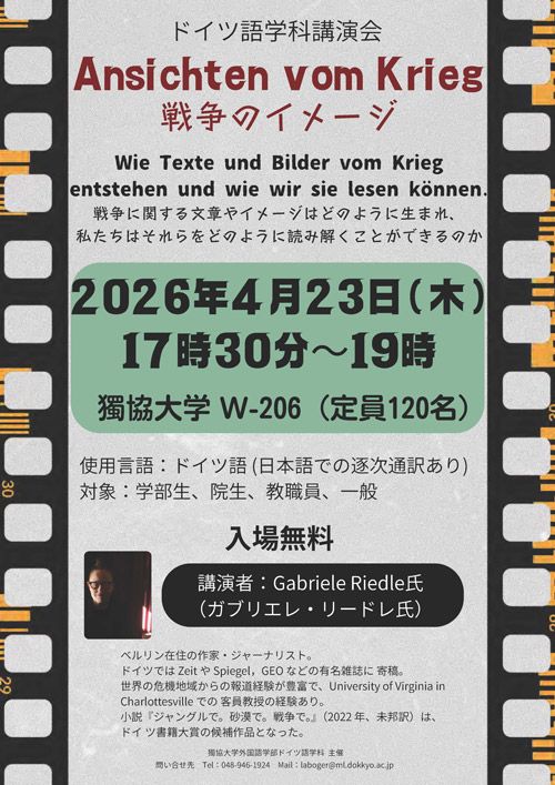 日 時:2026年4月23日(木)17:30~19:00 会 場:獨協大学 W-206教室 講 演:Gabriele Riedle氏 使用言語:ドイツ語 (日本語での逐次通訳あり) 入場料:無料 定 員:120名 対 象:学部生、院生、教職員、一般