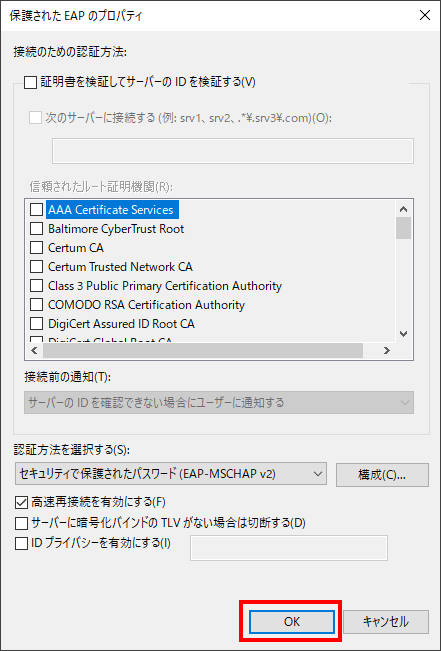 - 接続のための認証方法に、チェックが入っている場合はチェックを外して、「OK」をクリックします。